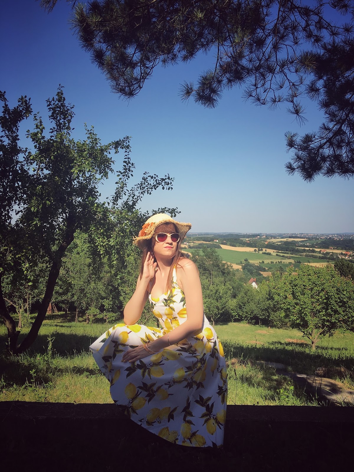 Odlučila sam se za divnu damsku haljinu sa limun printom, vintidž kroja, koja se vezuje oko vrata. Ukoliko vam se dopada, možete je pronaći ovde. Pamučna je i veoma udobna, tako da od mene imate toplu preporuku što se nje tiče. Ostatak kombinacije je sveden, kako bi trendi limun print najbolje došao do izražaja. Tu su retro rupičaste bele sandale sa malom potpeticom, bež naočare, slojevite narukvice i slamnati šešir.